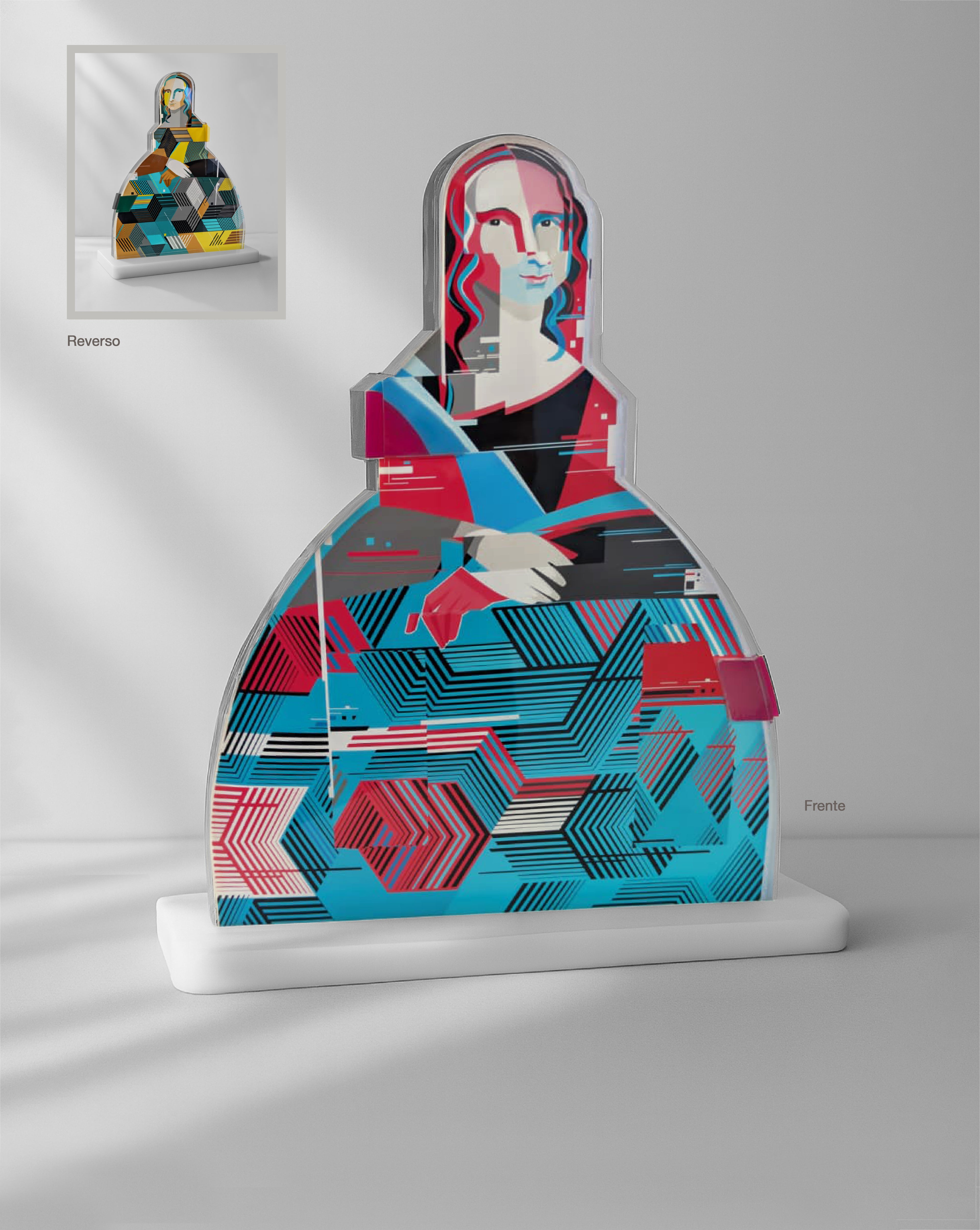 Técnica mixta: Dibujada a mano y coloreada digitalmente. Impresa con técnica Gicleé sobre papel metalizado e intervenida con papel foil, resina epóxica y marcadores.. Encapsulados en 2 bloques de acrílico de 1,9 cm de espesor, grabados y torneados. Unidos con acrilico blanco de 0,7 cm de espesor. Cada lado muestra una Menina diferente.
