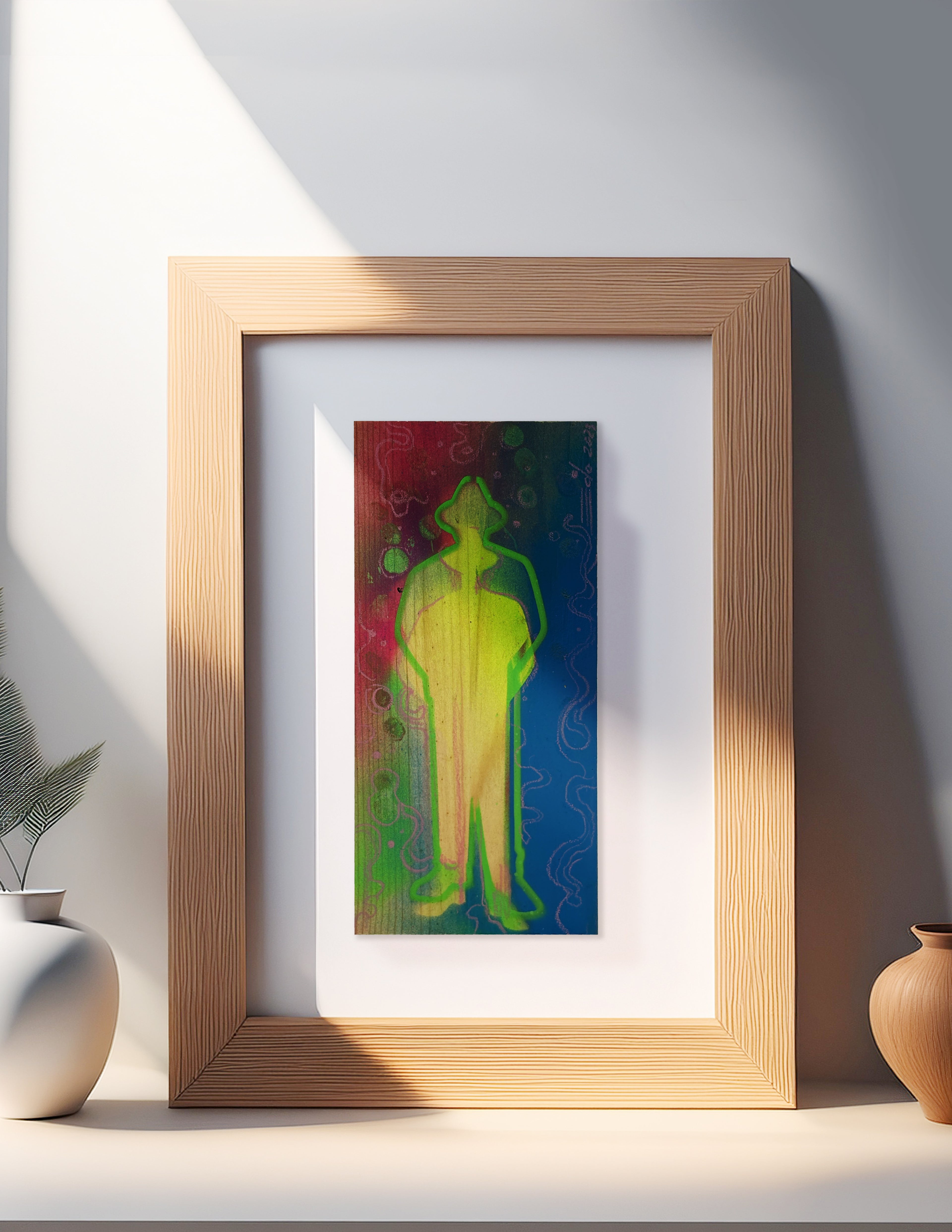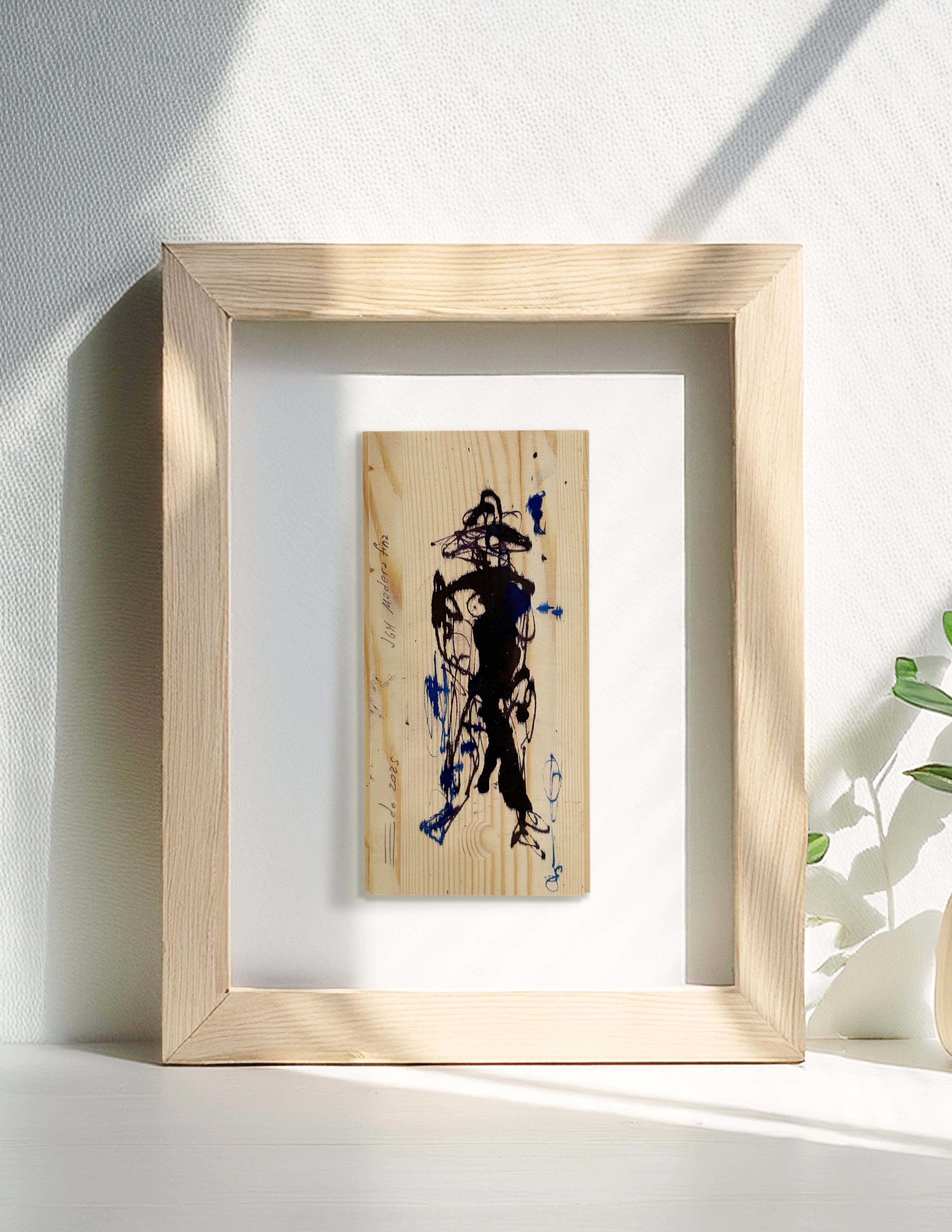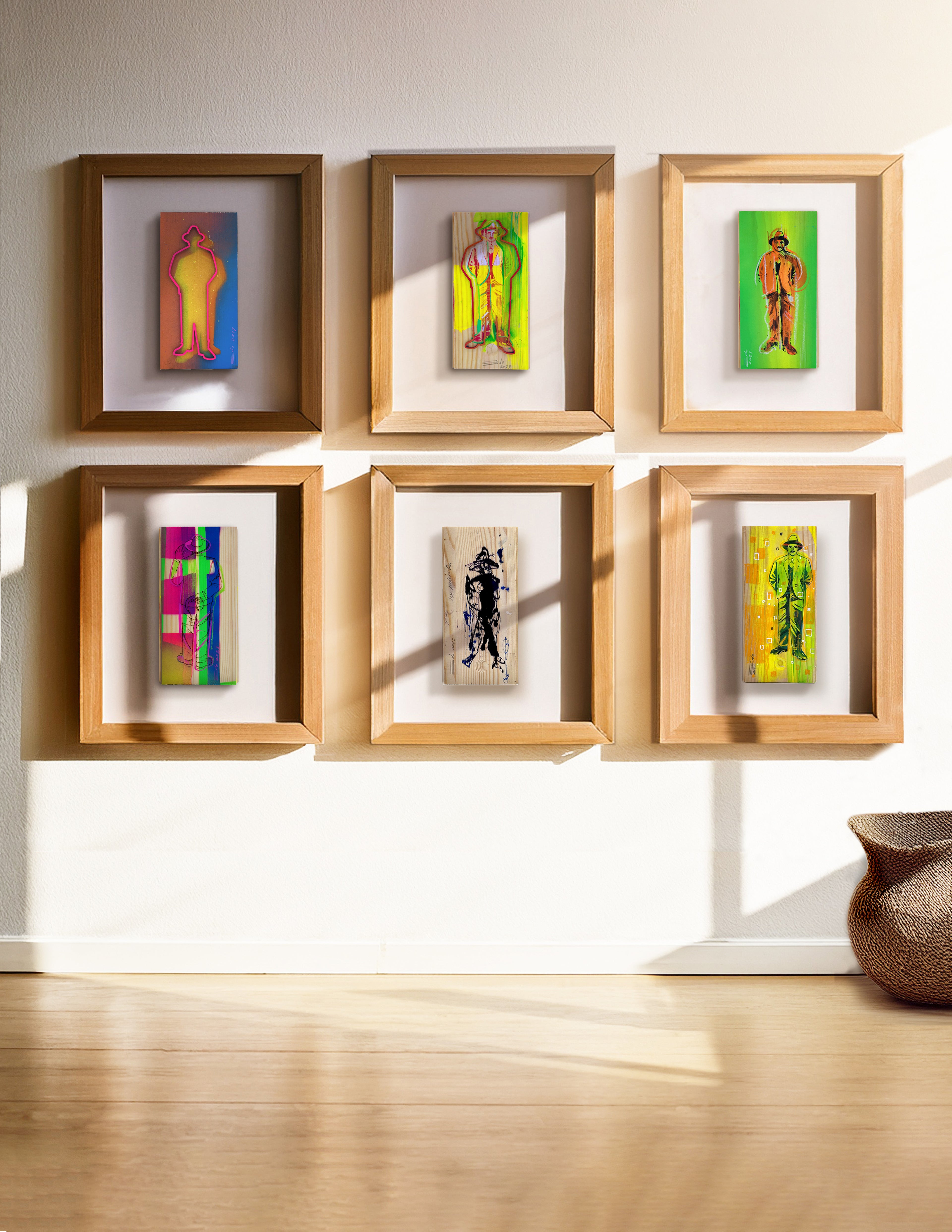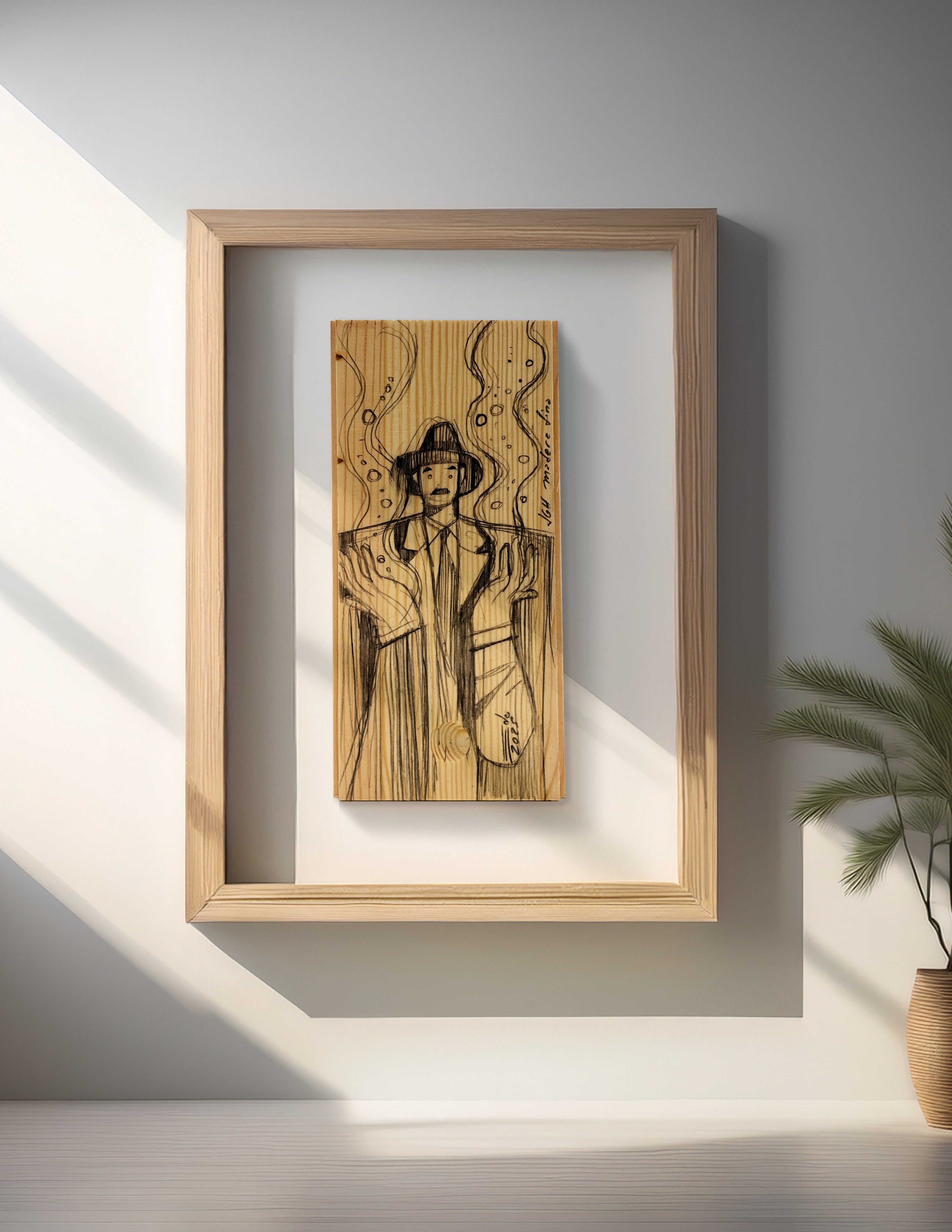 Madera Viva: Rinde homenaje a la esencia del soporte. Las vetas se integran a la pintura, las líneas se adaptan al pulso natural del material, y la figura humana o simbólica surge como una extensión del tronco y su memoria.