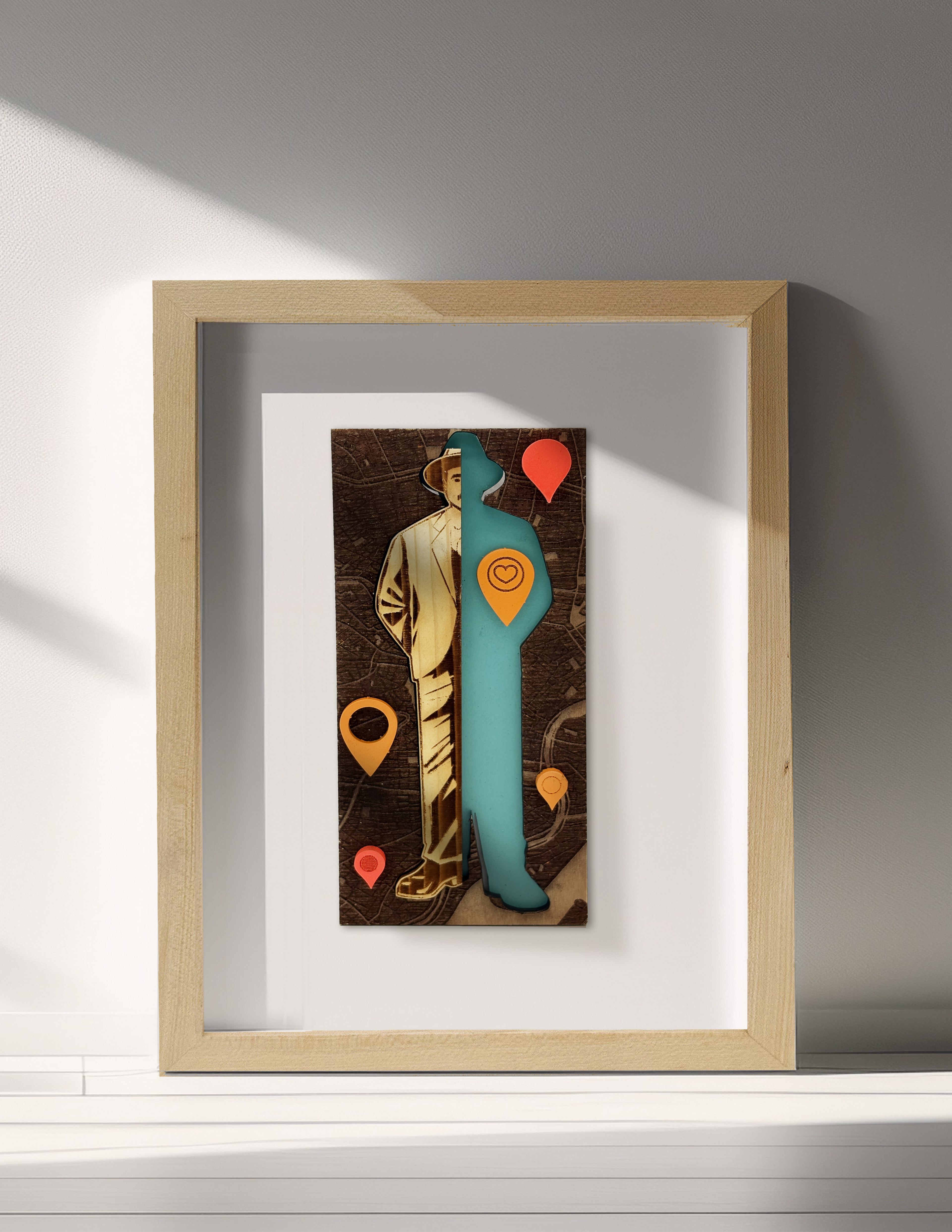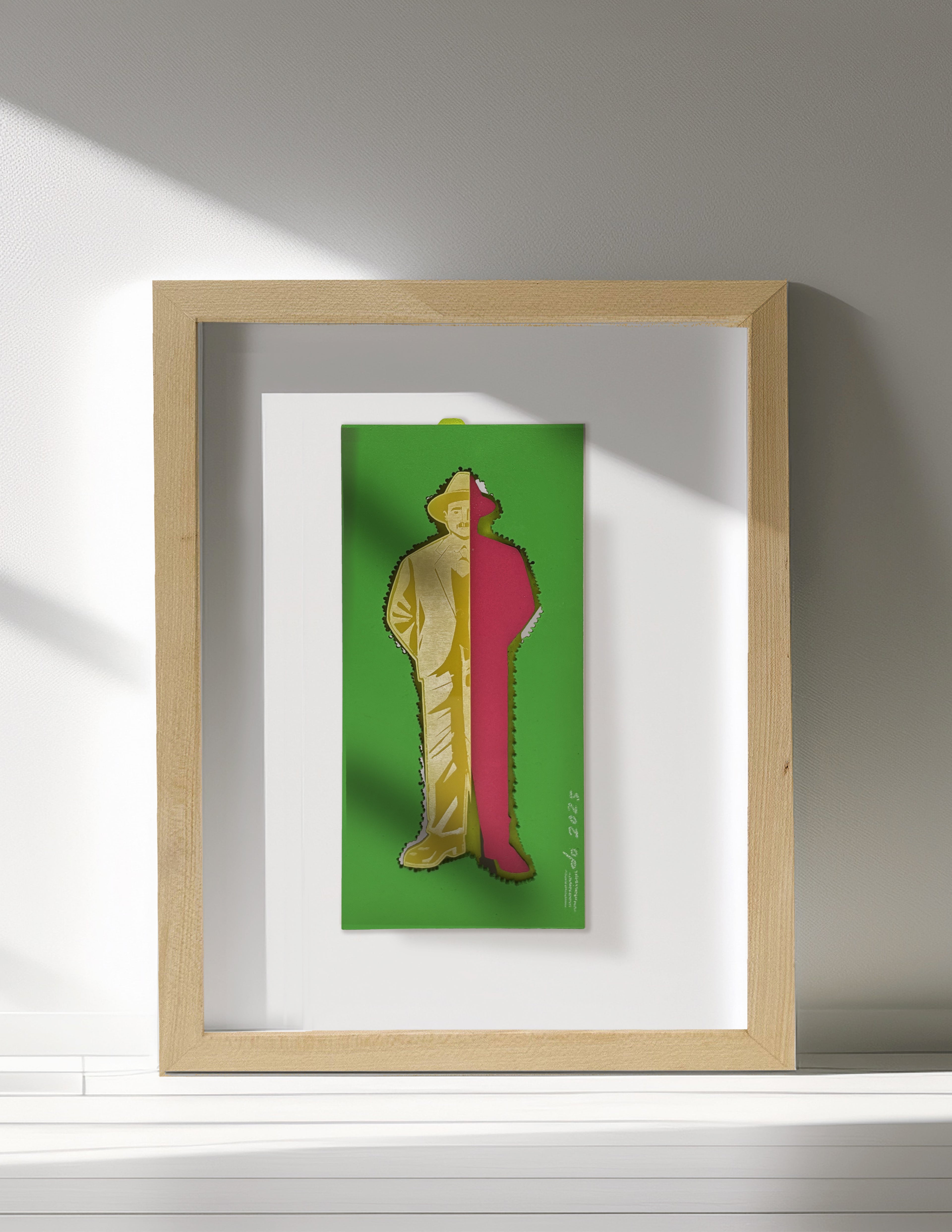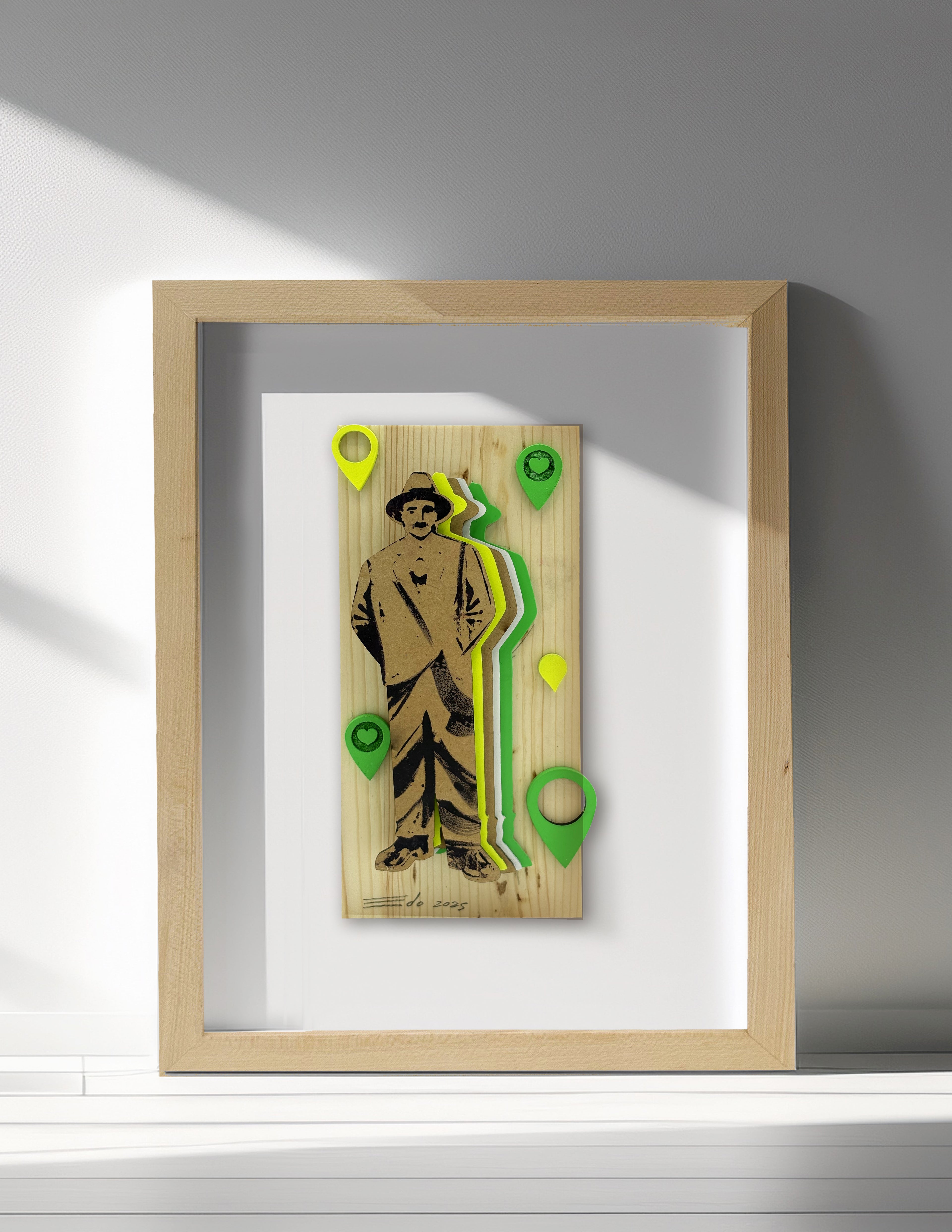 Ensamblaje: A través de cortes, superposiciones y relieves, el artista construye retratos que emergen desde la materia misma. Las vetas se transforman en líneas de expresión y las sombras en ecos de espiritualidad, revelando un JGH múltiple: humano, universal y cercano.