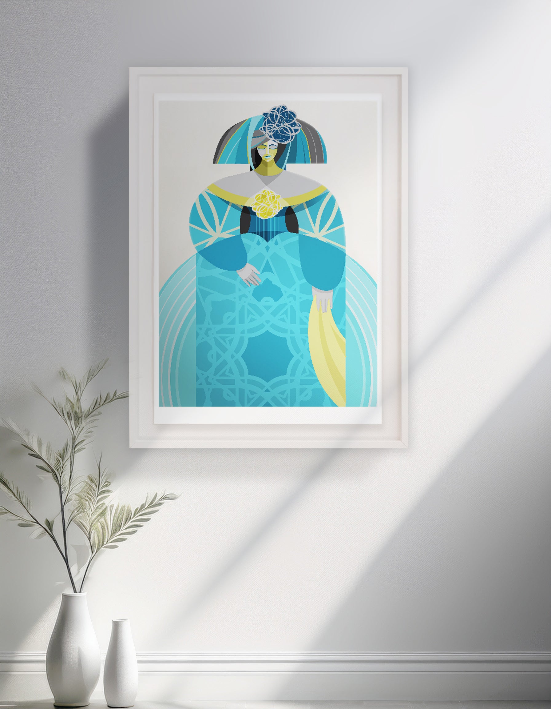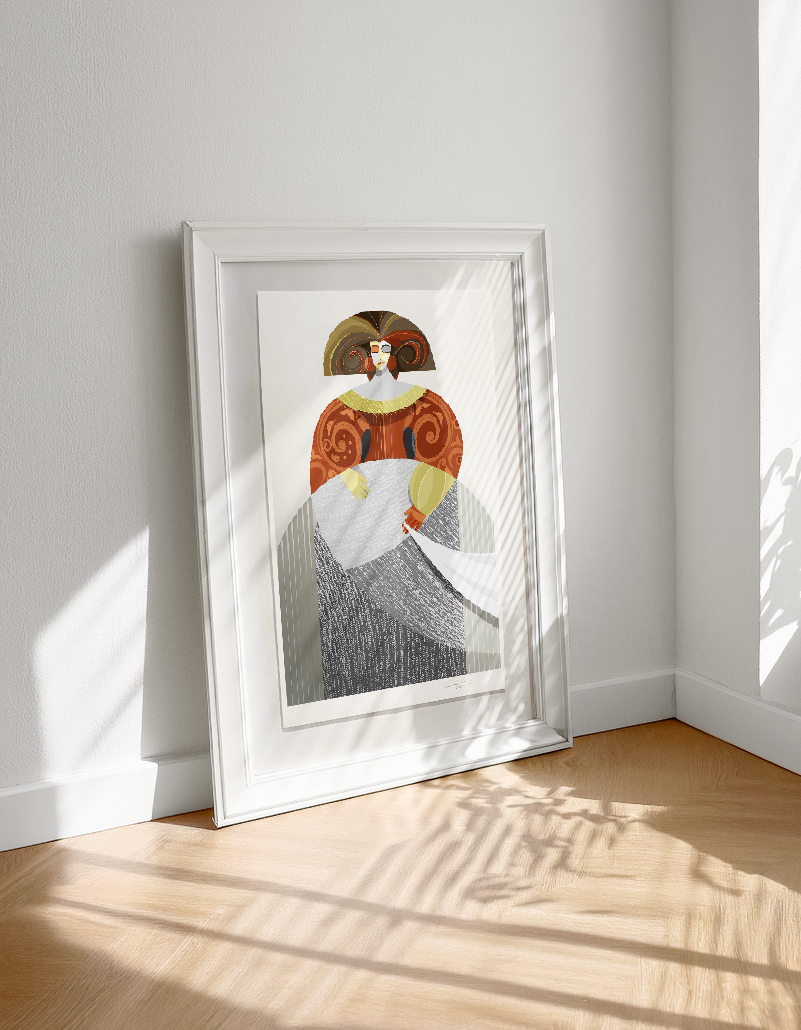 Técnica Mixta: Dibujada a mano y coloreada digitalmente. Impresa con técnica Gicleé sobre papel algodón alemán Hahnemühle e intervenida con crayones de óleo y acrílico.